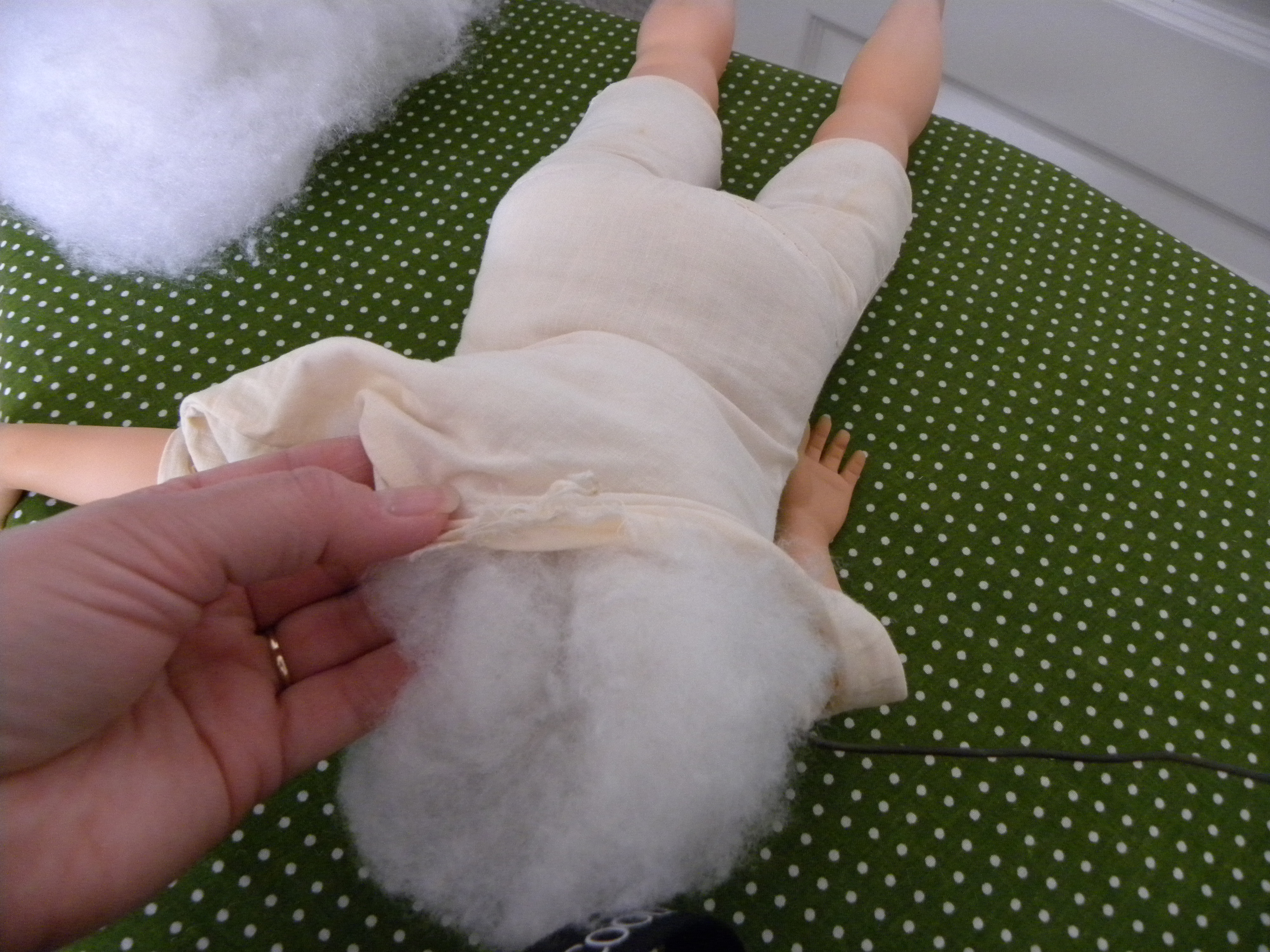 Hi, I was lucky enough to purchase, for a very minimal price, one of these Lonesome Lisa dolls. I feel very fortunate that she had her original dress, in excellent condition, and also that when I re-stuffed her, I left as much of her in-tact as possible. I only opened the back stitching, which runs horizontally across the rear end. I was able to gently empty out the disintegrated, foam stuffing and then cautiously washed her in a cold bath of sudsy laundry soap. After rinsing all soap out and hanging to dry by her shoulders on the clothes line, I was ready to re-stuff her. This I did while leaving her armature in place, and only re-fitted it into her head, etc. Then she was stuffed with poly-cotton blend quilt batting cut into rectangular pieces, and gently pushed in firmly with a wooden dowel. I re-stitched the one seam, and wha-la! She was done! This worked beautifully, thank goodness!