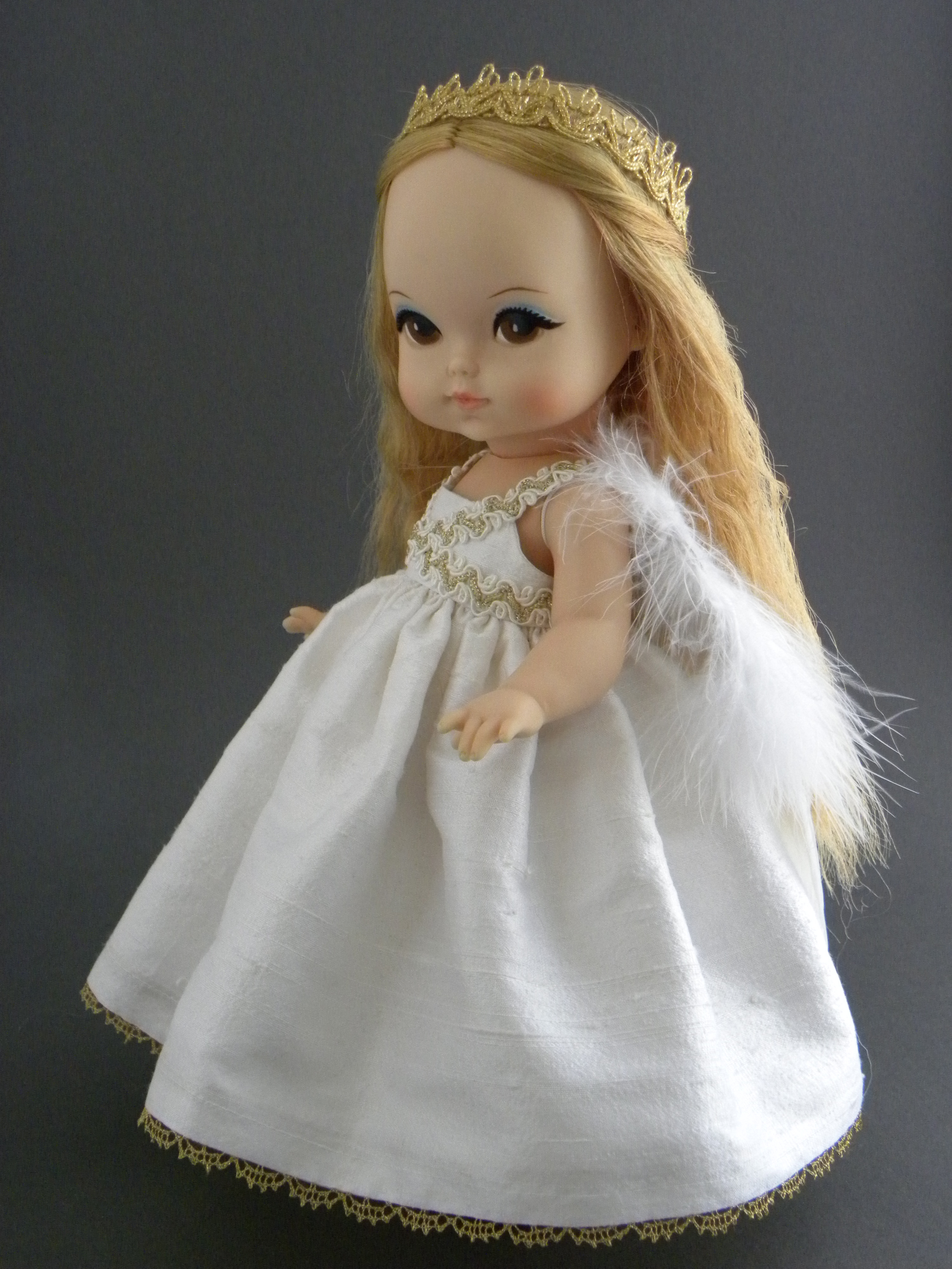 I love Joy, as you can tell. She’s the little toddler with attitude. She made the perfect model for my angel ensemble, complete with removable angel wings. Her long, pre-Raphaelite tresses were originally braids and she was dressed as a little Swedish girl. By the time she came to me, little was left of her original costume and she was a very untidy girl. I unbraided her hair and thoroughly washed her. Her hair, after spending almost 50 years in braids, remain permanently waved. I’m a bit in love with her, but she is getting ready to fly away, off to another home. Check her out here.