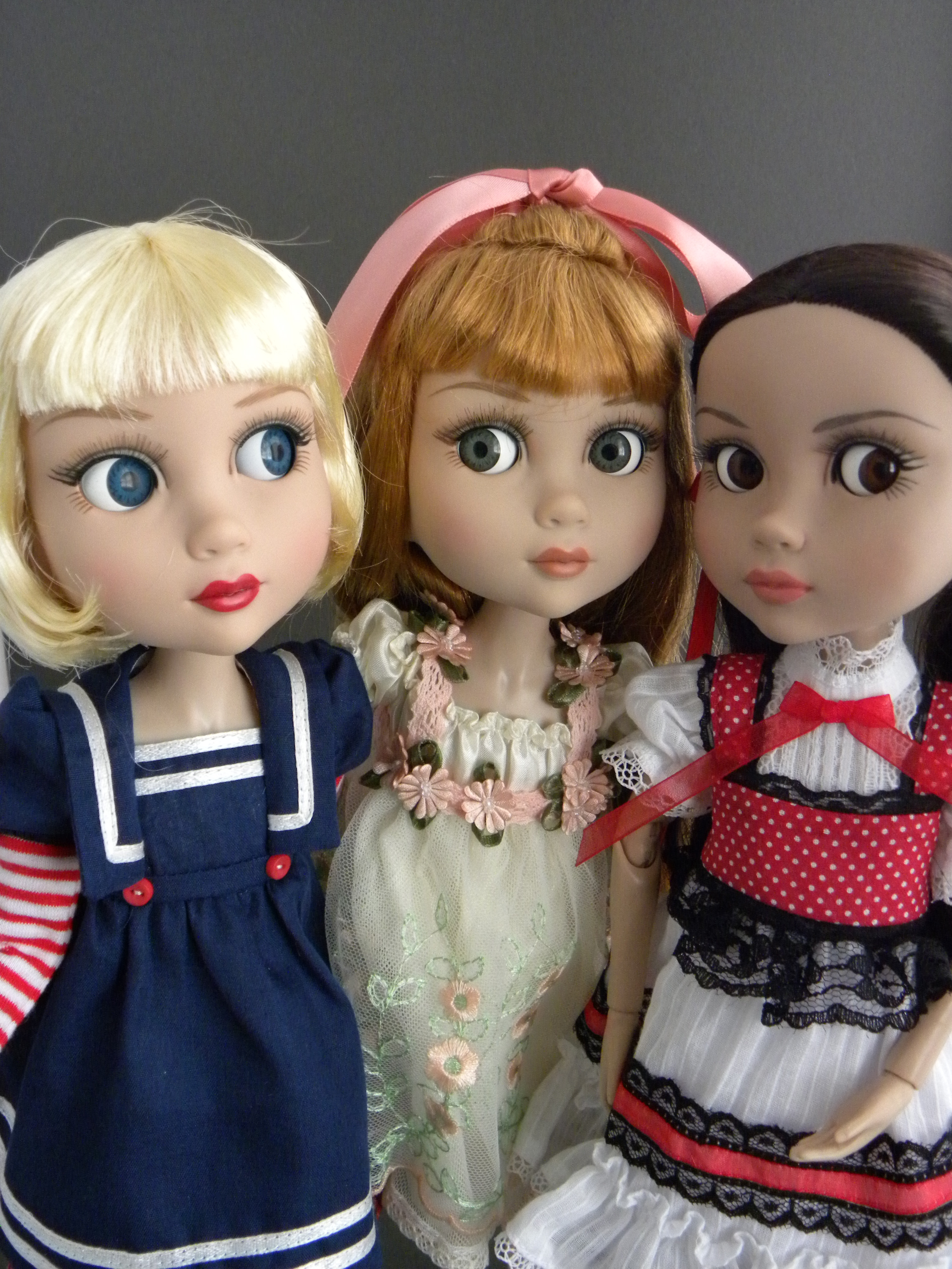 Patience is available on the Wilde Imagination website. The three I have featured here are Garden Patience (the lovely red head, no longer available on the website), Ahoy Patience (the bobbed blonde in a sailor dress) and Thru the Woods Patience (the Red Riding Hood brunette). These are adorable dolls! Unlike some articulated dolls, these girls have tight joints and can hold a pose and stand on their own. No stands to deal with! This makes photographing them so much easier than a lot of other dolls. If I displayed them, however, I would still use a stand. Their eyes do like to drift, though. Interestingly, their eyes move independently of each other so they glide from cross-eyed to wall-eyed very quickly. A little tap on the head usually resolves the issue right away.